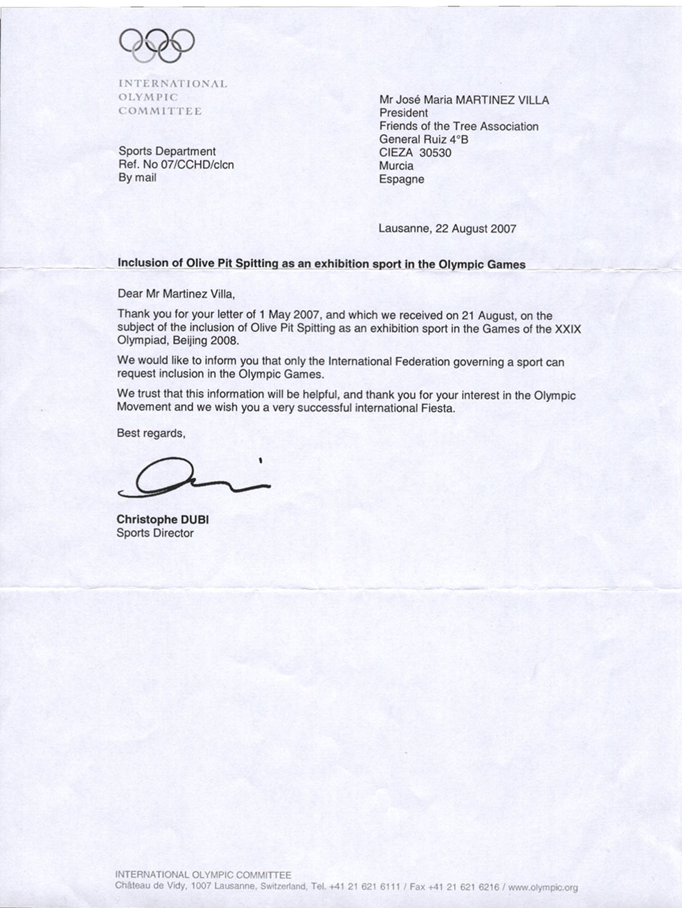 Carta del COI a la Asociación Amigos de las Oliveras